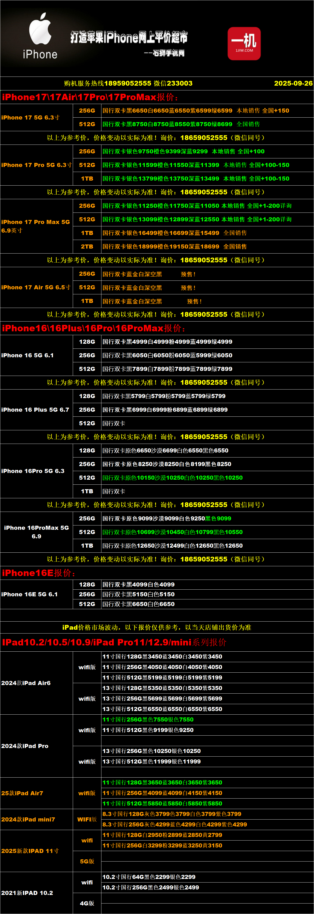 一机网手机报价单09-26