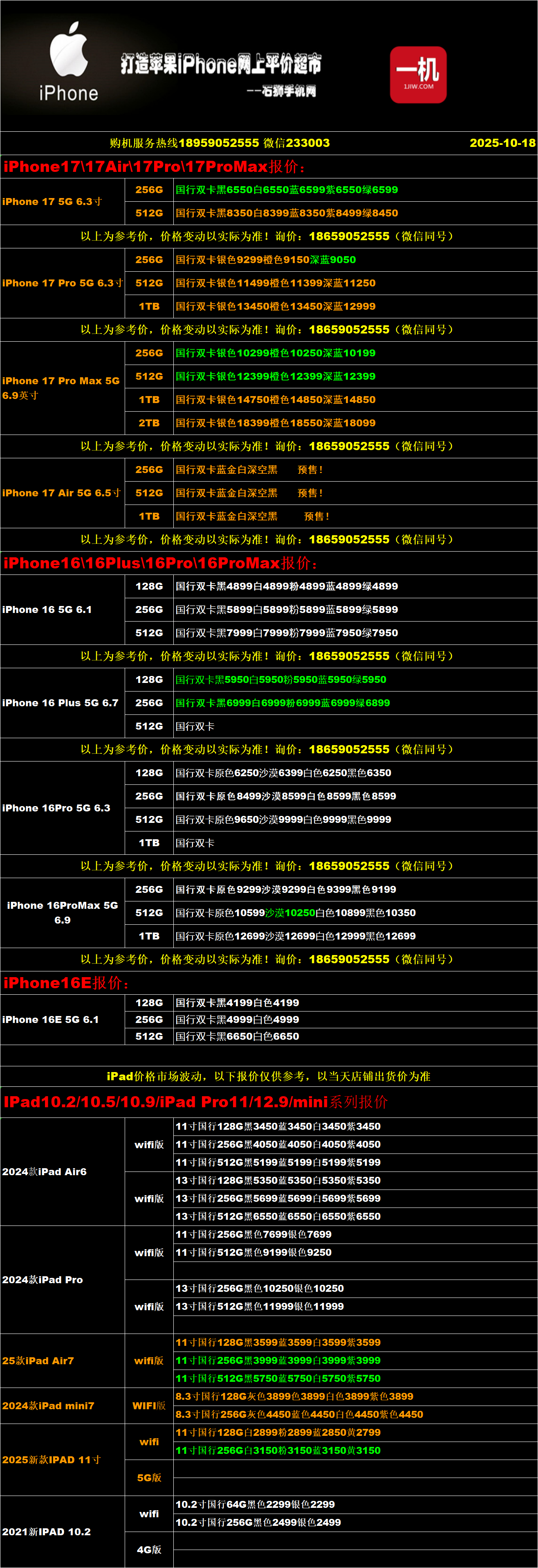 一机网手机报价单10-18