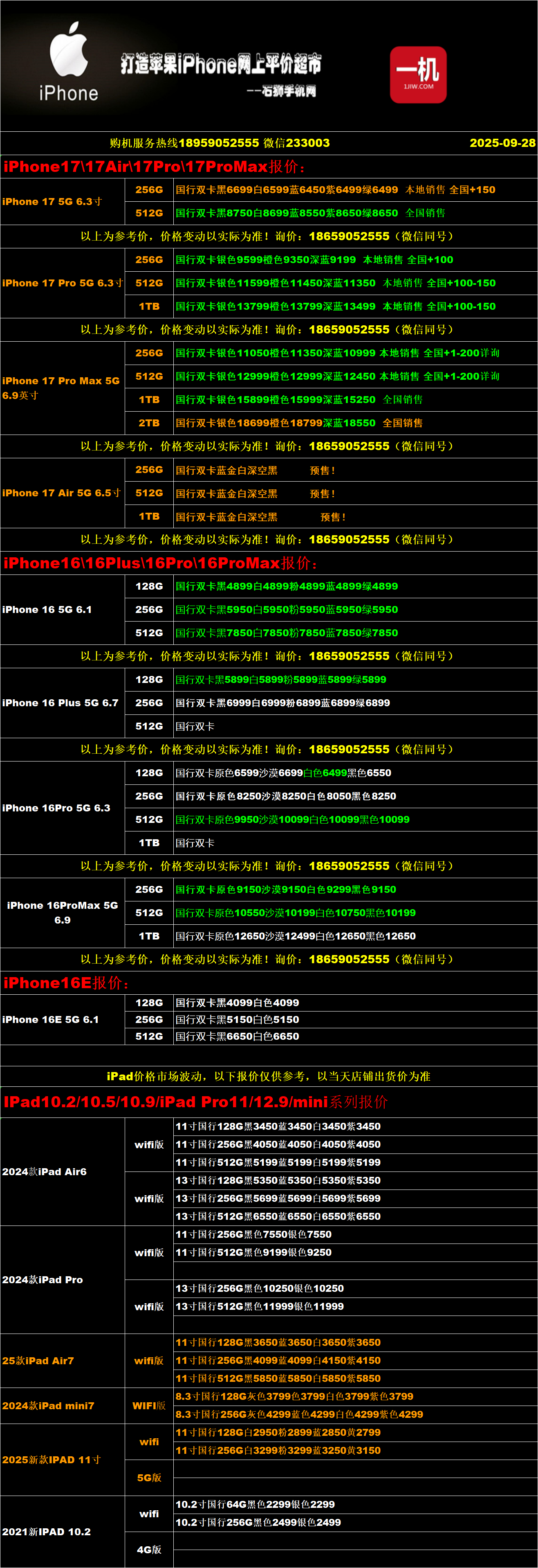 一机网手机报价单09-28