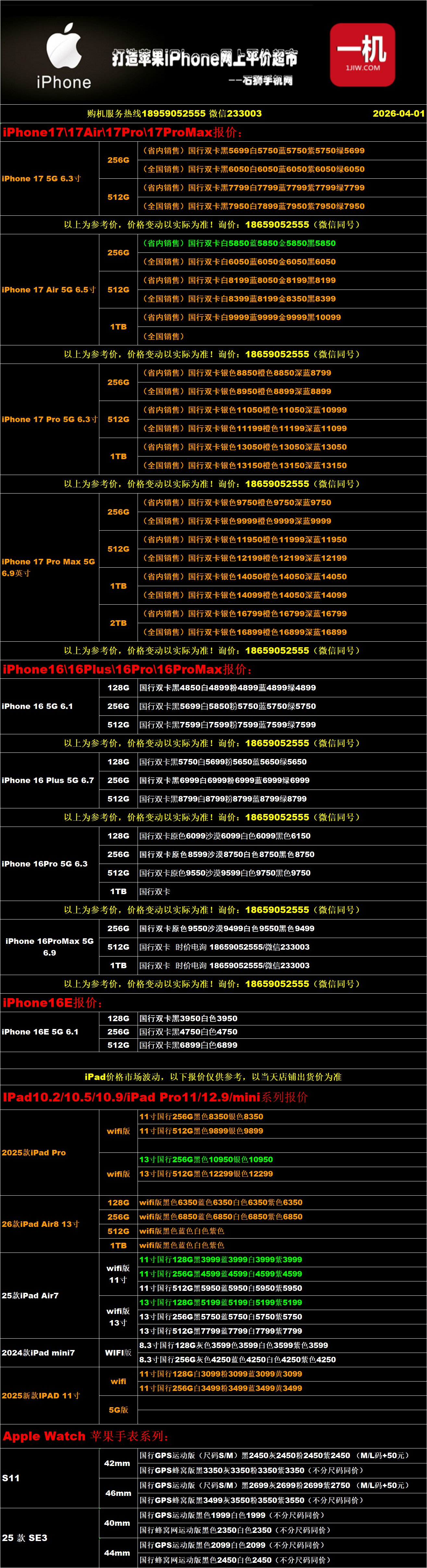 一机网手机报价单04-01